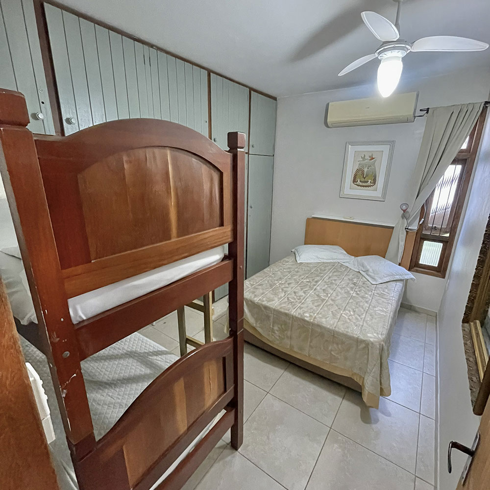 - 2 quartos, sendo 1 com cama de casal e beliche, e outro com cama de casal e sofá-cama