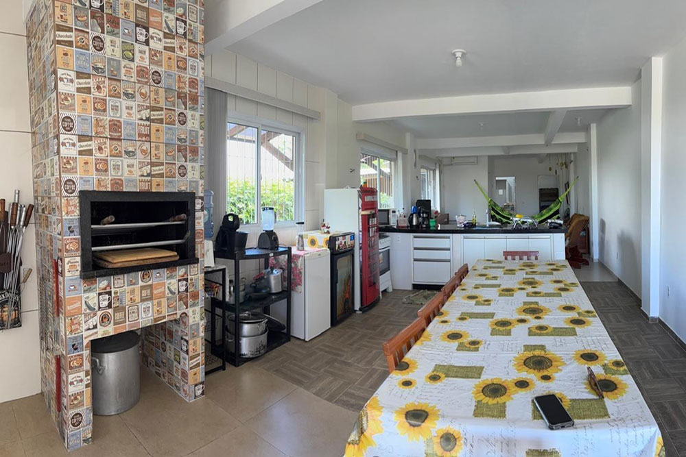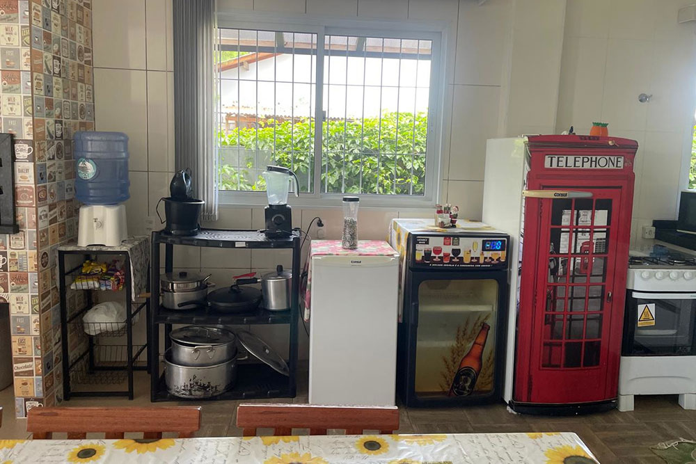 - Cozinha completa (c/ churrasqueira, liquidificador, batedeira, sanduicheira, jarra elétrica, cafeteira, microondas)