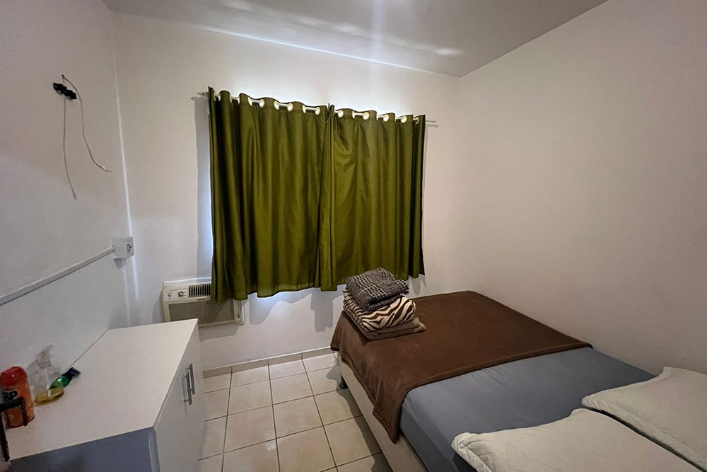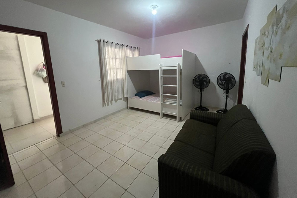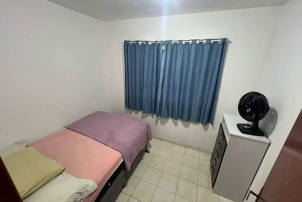 - 02 quartos (1 quarto com ar condicionado, cama de casal e armário, e 1 quarto com cama de casal, ventilador e armário)