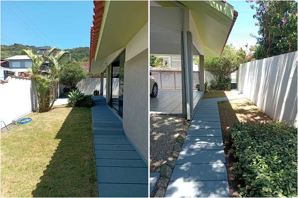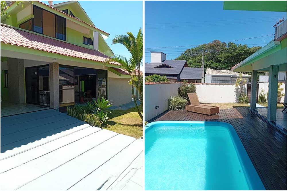 Duas salas sendo uma de estar com TV e vista para piscina e uma com lareira, banheiro social, cozinha completa com geladeira duplex, micro-ondas, forno elétrico, cafeteira, suggar, liquidificador, torradeira, pátio com grama e jardim, internet Wi-Fi, piscina com deck, bela área para churrasco com mesa de mármore que acomoda mais de 12 pessoas, dois chuveiros externos, garagem coberta para quatro carros, área de serviço com máquina de lavar, a casa contém aquecimento solar para os chuveiros e pia da cozinha.