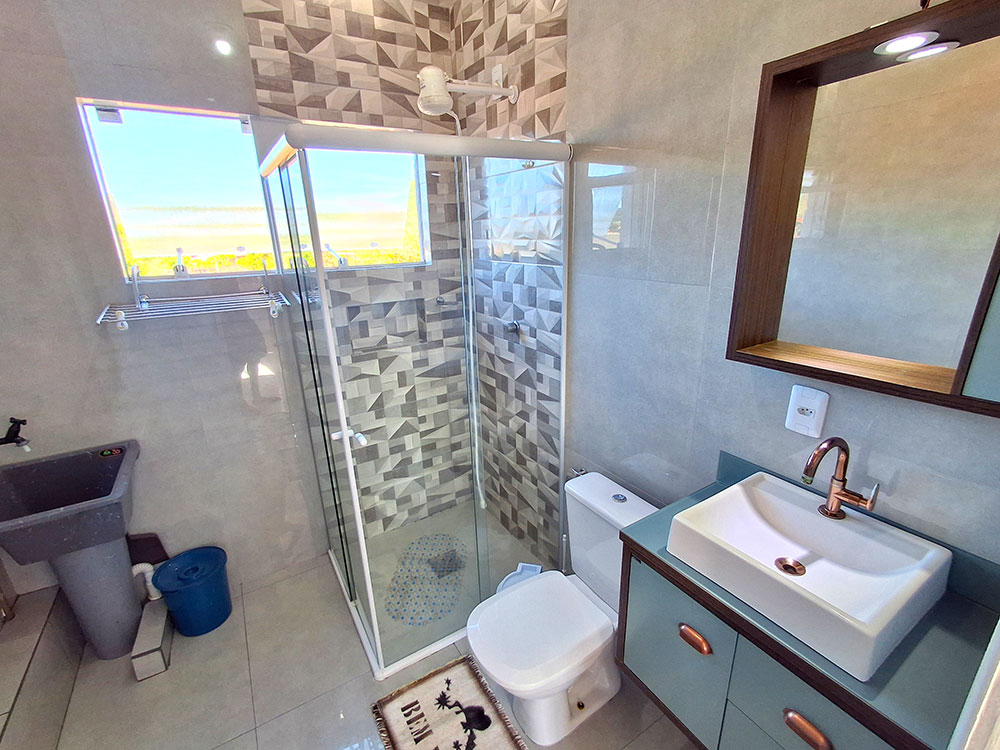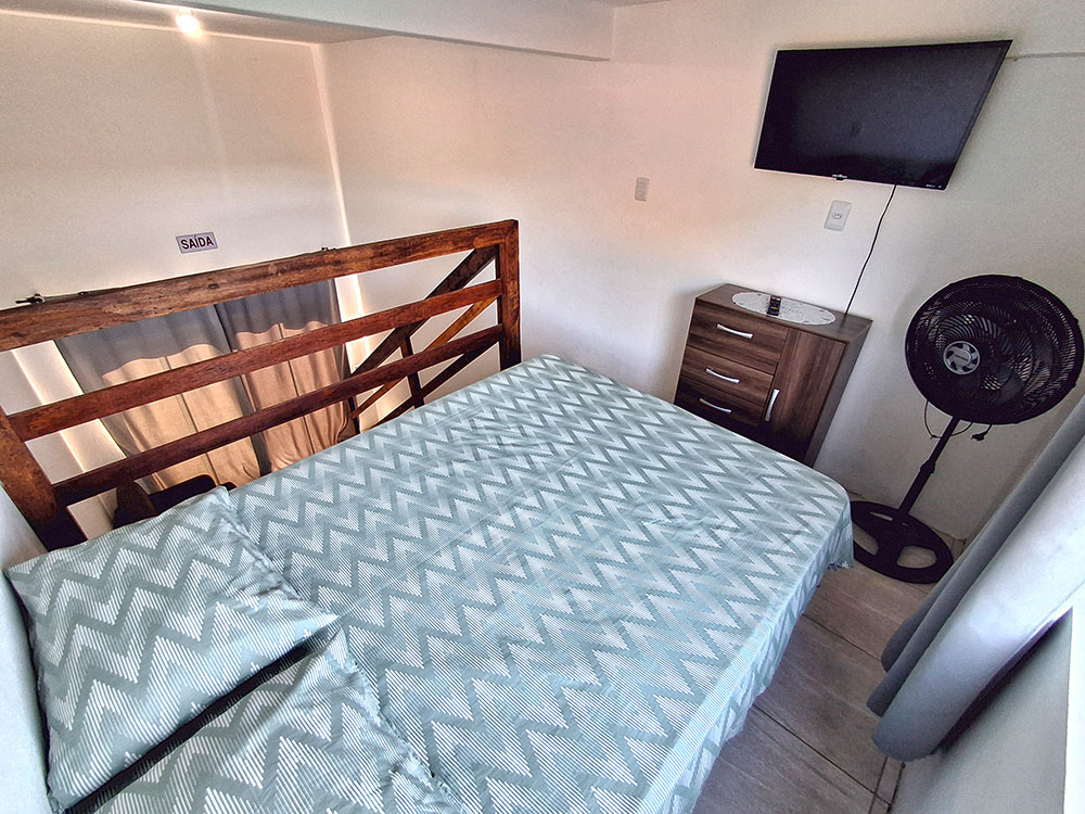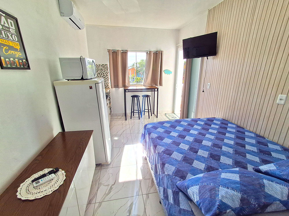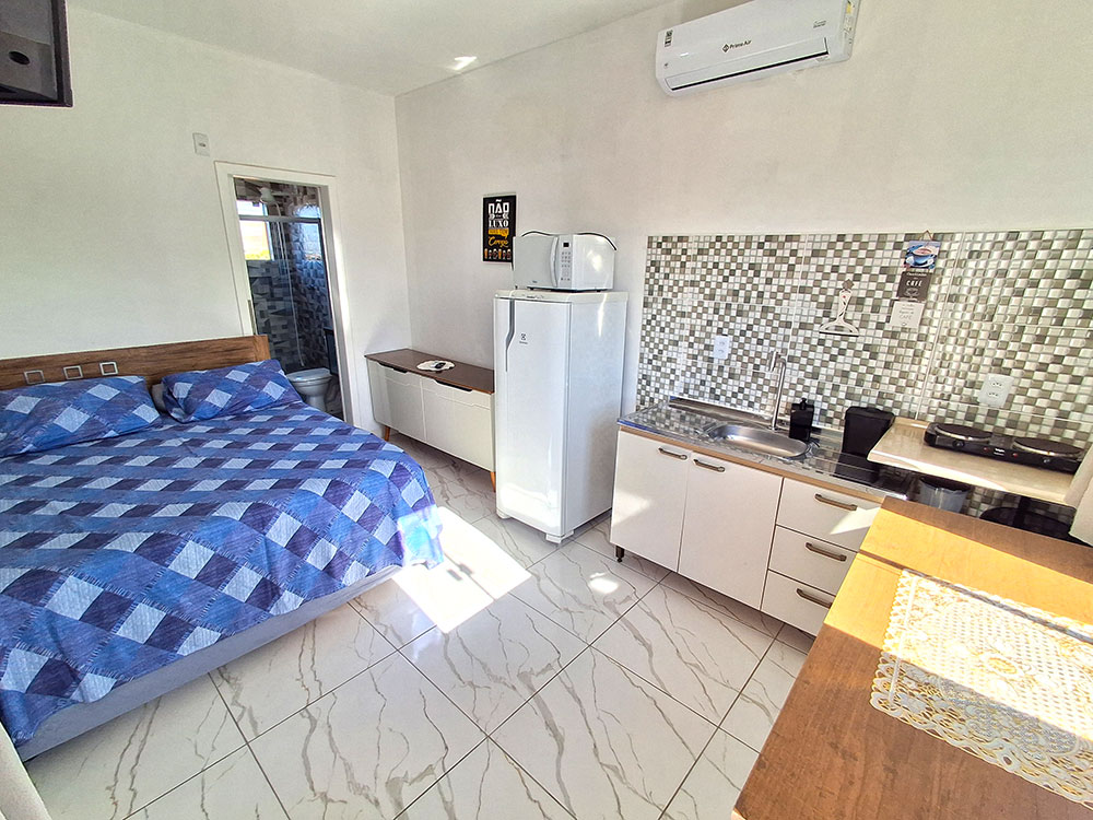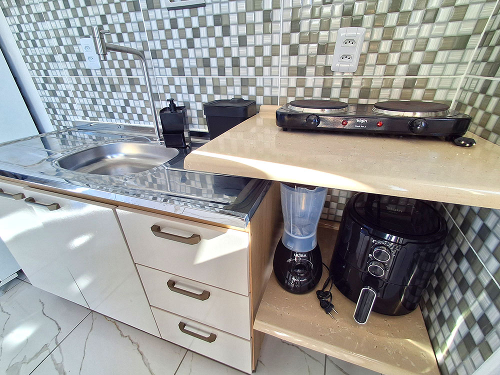 - Cozinha completa (com microondas, air fryer, chaleira elétrica, garrafa térmica e fogão elétrico 02 bocas)