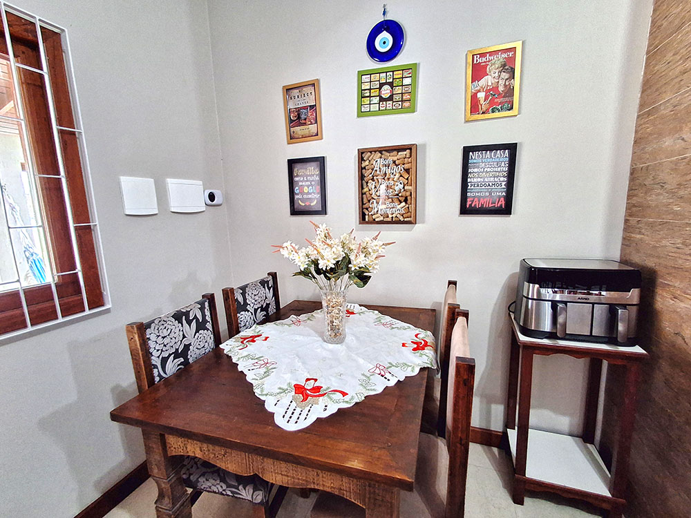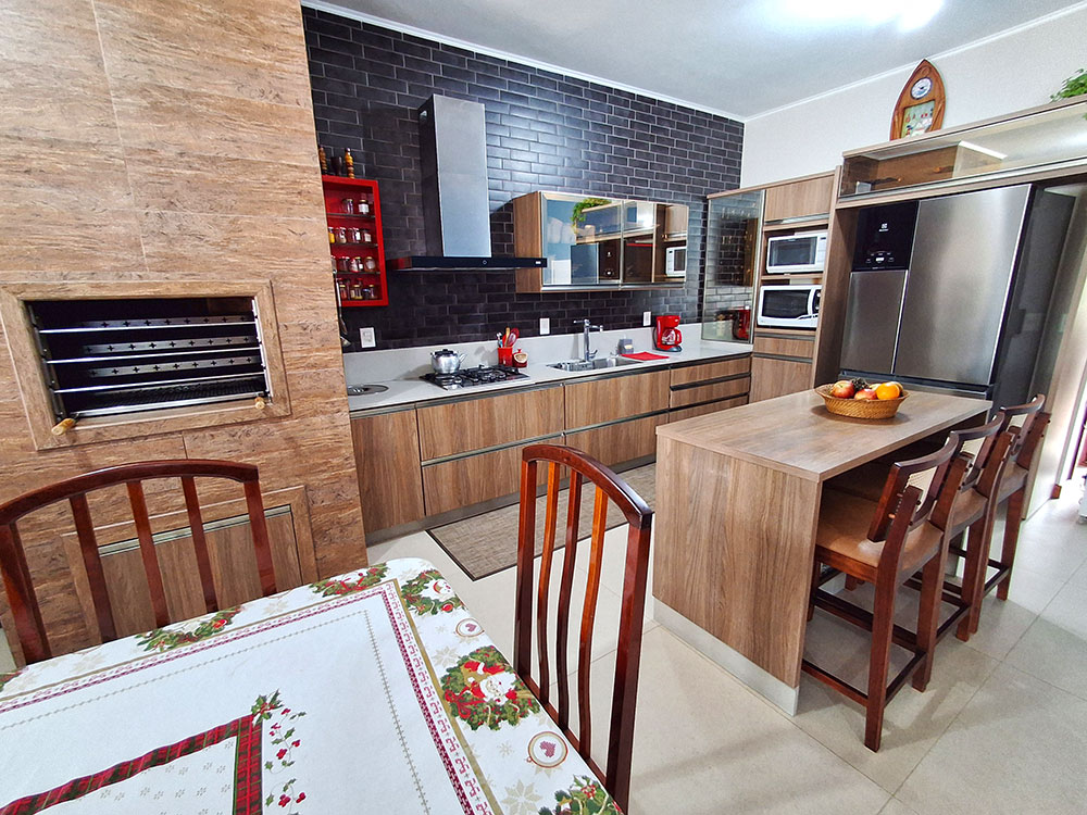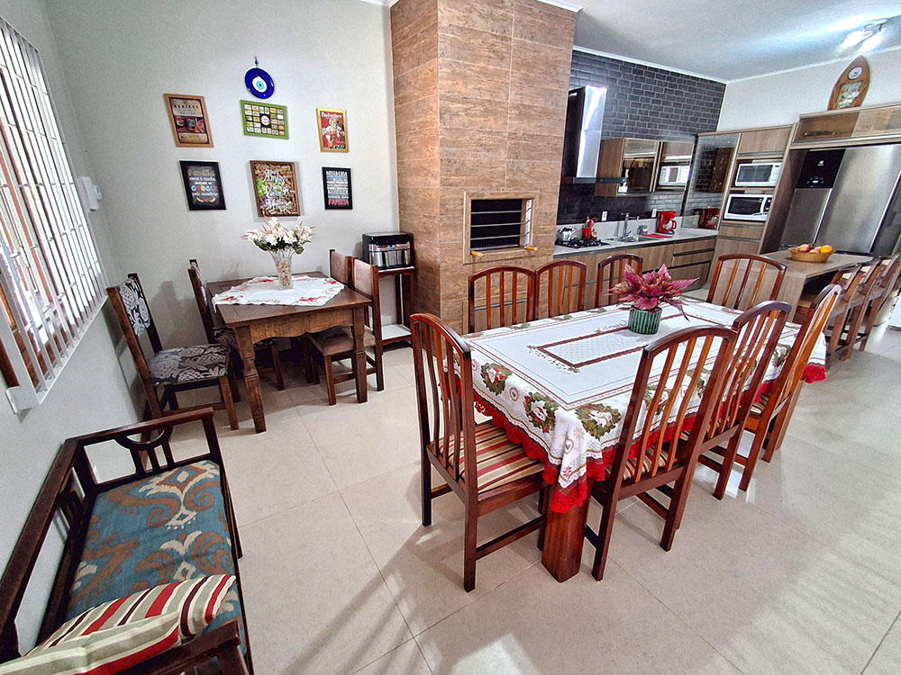 • Cozinha completa (com geladeira duplex, microondas, forno elétrico, liquidificador, air fryer, sanduicheira, cafeteira, churrasqueira, espetos e grelha)