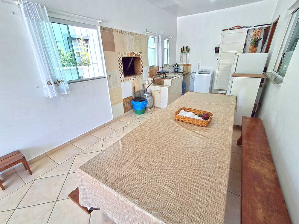• Área de lazer (com churrasqueira, espetos, grelha, fogareiro com disco, forno elétrico, freezer e máquina de lavar roupas)