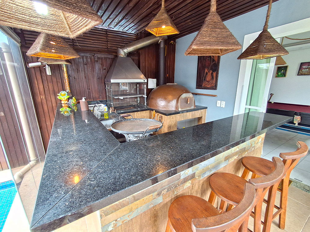 - Área gourmet (com churrasqueira, espetos, grelha e forno de pizza)